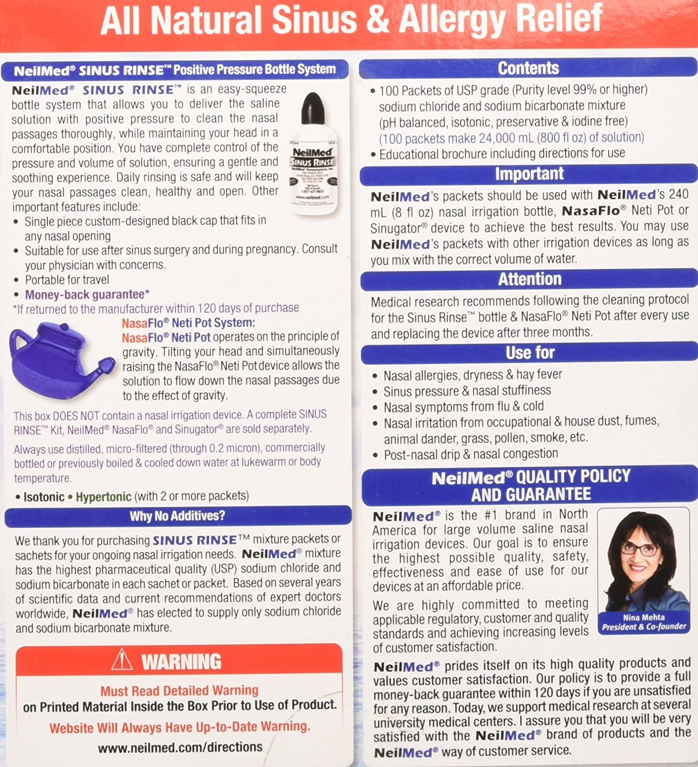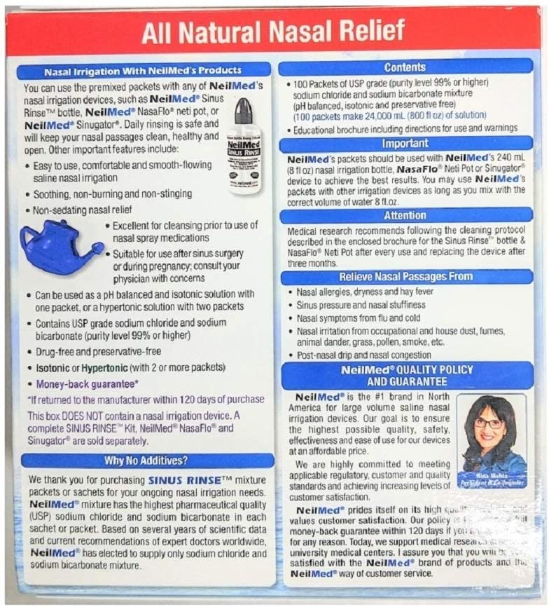 - Always rinse your nasal passages with NeilMed SINUS RINSE packets only. Our packets contain a mixture of USP grade sodium chloride and sodium bicarbonate. These ingredients are of the purest quality available to make the dry powder mixture. Rinsing your nasal passages with only plain water without our mixture will result in a severe burning sensation as the plain water is not physiologic for your nasal lining, even if it is appropriate for drinking. Additionally, for your safety, do not use tap or faucet water for dissolving the mixture unless it has been previously boiled for five minutes or more as boiling sterilizes the water. Other choices are distilled, micro-filtered (through 0.2 micron), commercially bottled or, as mentioned earlier, previously boiled water at lukewarm or body temperature. You can store boiled water in a clean container for seven days or more if refrigerated. Do not use non-chlorinated or non-ultra (0.2 micron) filtered well water unless it is boiled and then cooled to lukewarm or body temperature. Do not rinse if your nasal passages are completely blocked or if you have an ear infection or blocked ears. If you have had recent ear or sinus surgery, contact your physician prior to irrigation. If you experience any pressure in the ears or burning in the nasal passages, stop irrigation and get further directions from your physician. Keep out of reach of children. Read and retain this enclosed brochure for instructions and other important information.
